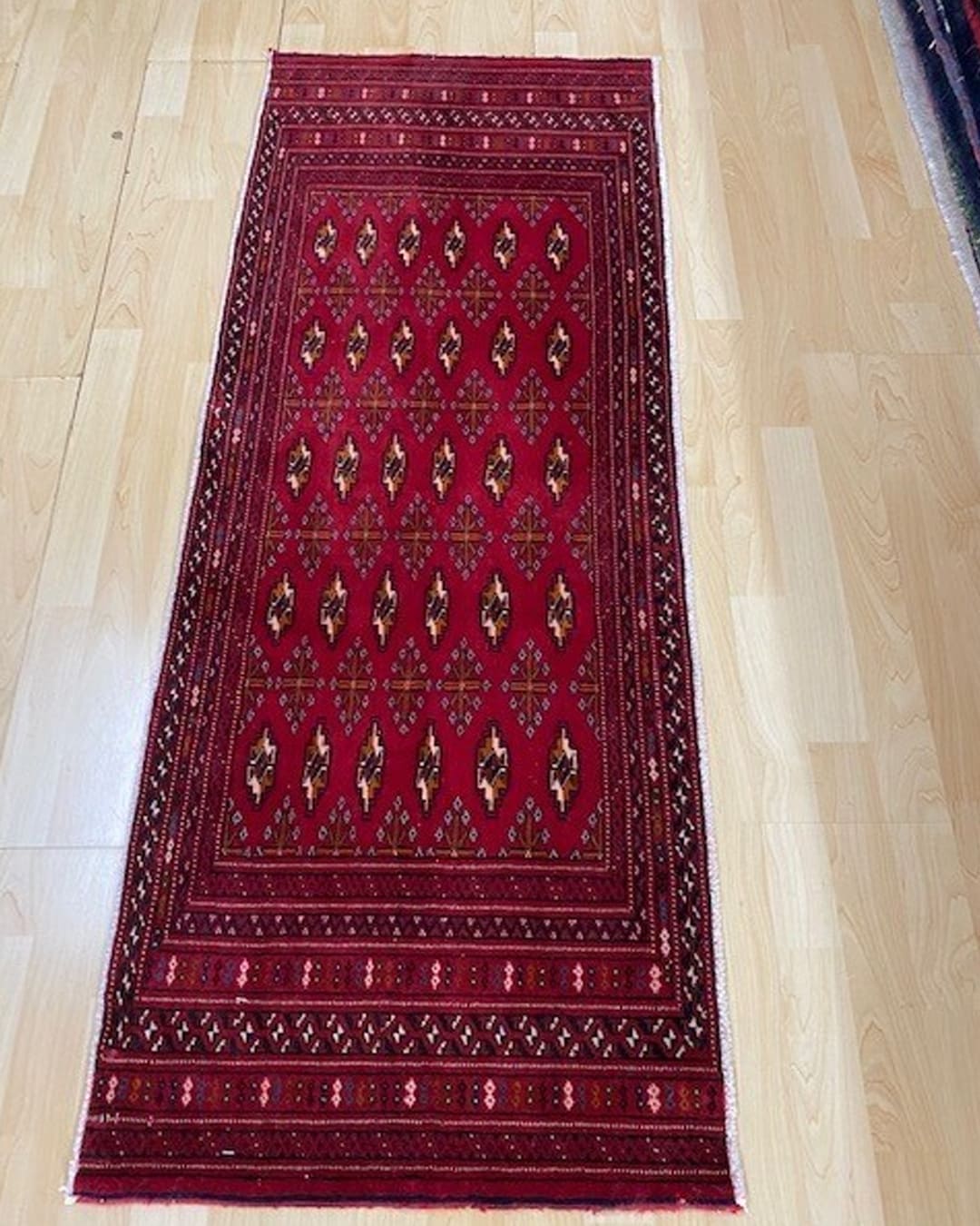 Handmade Persian Turkeman rug with a very fine weave and colours and patterns. Organic colours hard wearing .