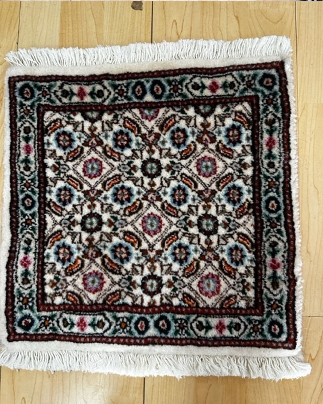 This is a very fine handmade rug from moud in lovely patterns and colours and also a very fine weave.