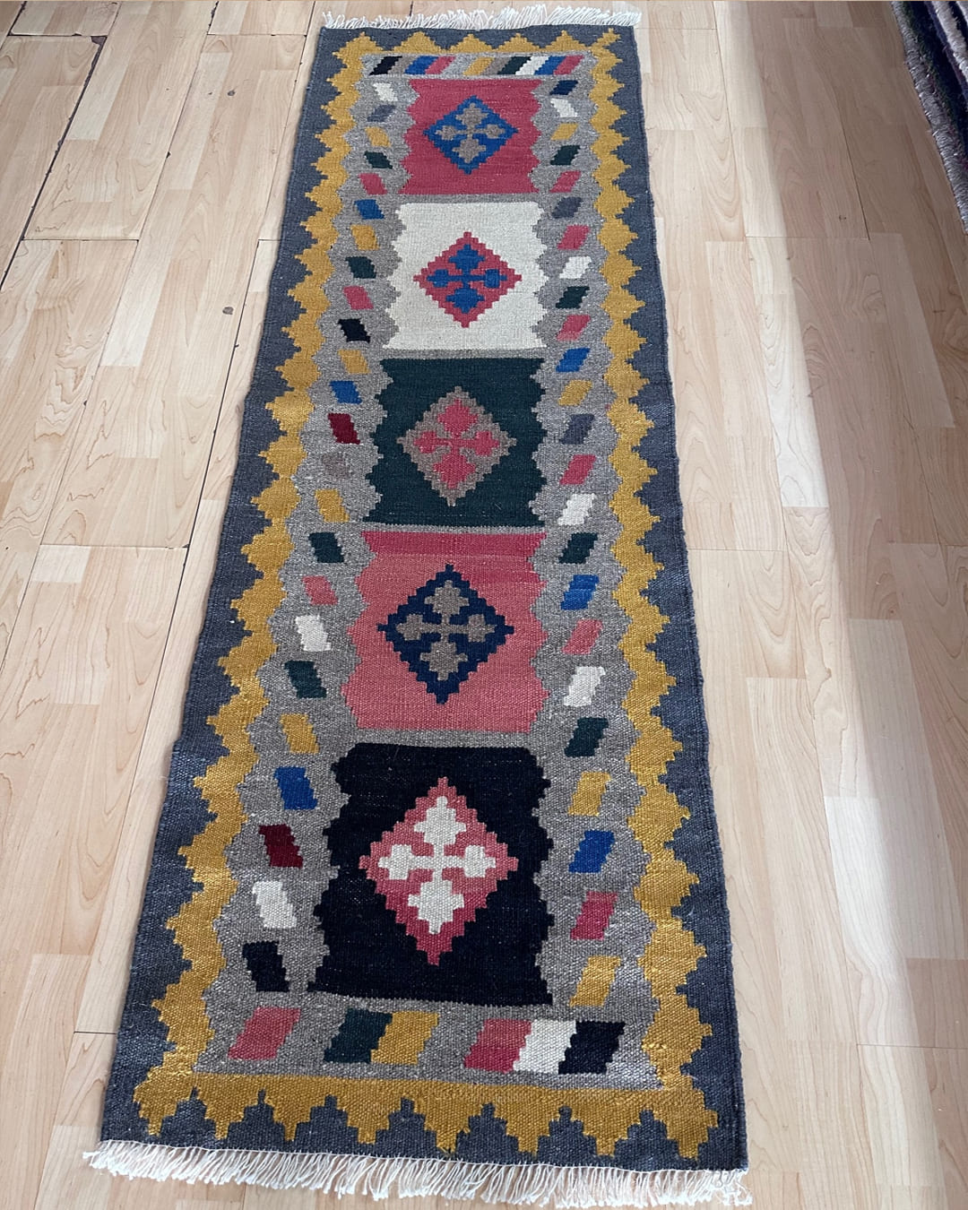 Hand-woven Persian kilim rug from Shiraz in fine wool and organic colour .