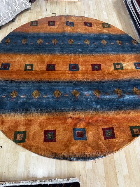 This handmade fine Gabbeh Shirazi round shape is very nice for any kind of floor with thick pile and natural colours.
